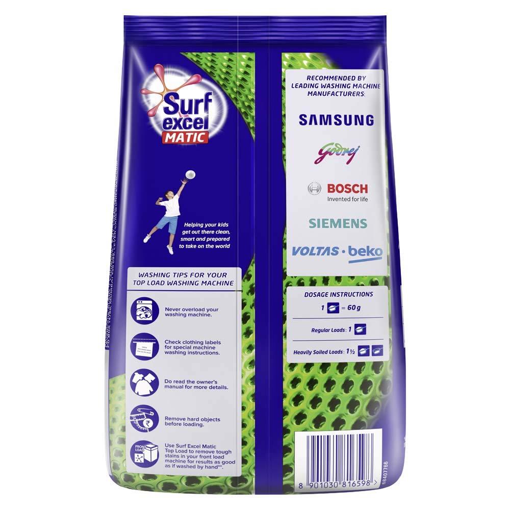 packaging may vary - also available in polybag Surf excel matic top load laundry detergent is designed to work in high water level (40 liters) of top load washing machines Surf excel matic top load laundry detergent dissolves completely leaving no residue on your clothes on in the machine Surf excel matic top load laundry detergent has an advanced technology that gives you handwash like clean in machines itself 1 scoop of Surf excel matic = 2 scoops of ordinary handwash detergent Surf excel matic top load laundry detergent is the no.1 matic detergent and is recommended by leading washing machine manufacturers