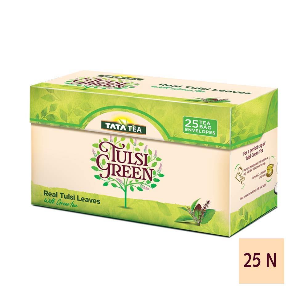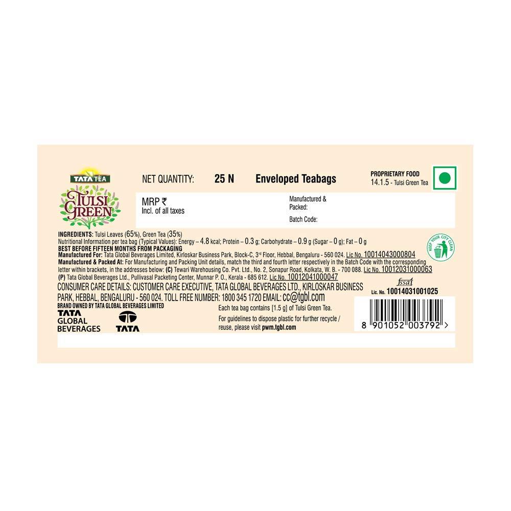 Real tulsi leaves with green tea 3 Benefits of tulsi - improves immunity, has a calming effect, betters digestion With tata tea tulsi green, we bring you the traditionally known benefits of tulsi in a refreshing cup of tea Proprietary food No preservatives No added flavours Country of Origin: India
