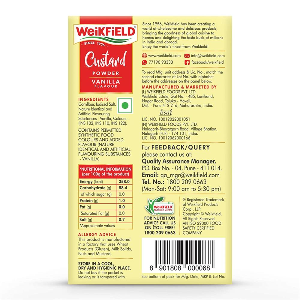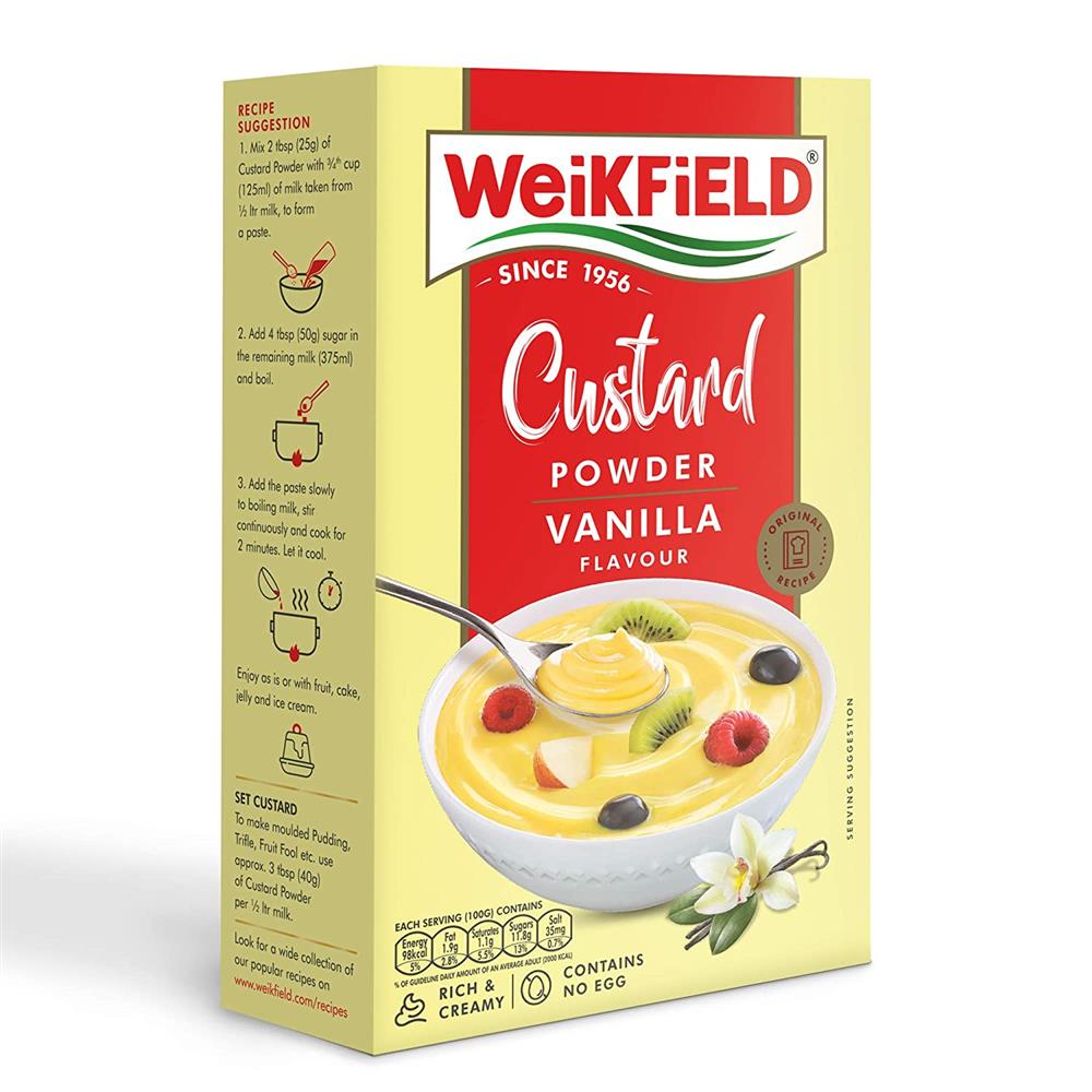 This is a Vegetarian product. Delicious milk additive for children Can be consumed as hot or cold custard and, with the addition of fruit salads, creamy toppings or nuts etc Becomes a trifle pudding for a delicious ending to any meal Available in four mouth-watering flavours of vanilla, aamras (mango), strawberry and butterscotch Country of Origin: India
