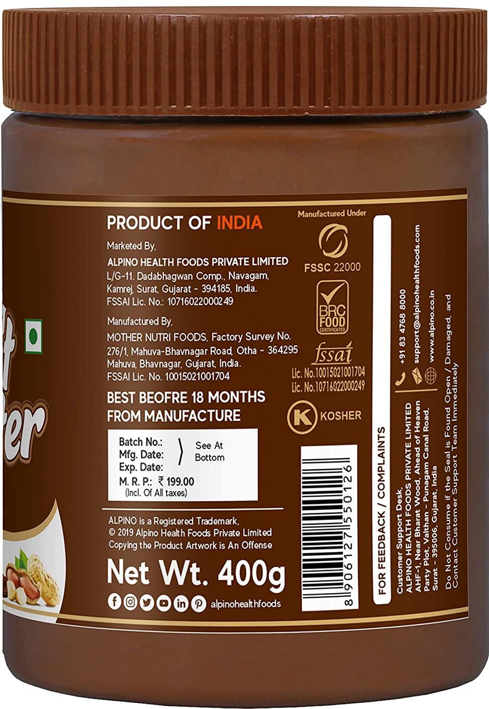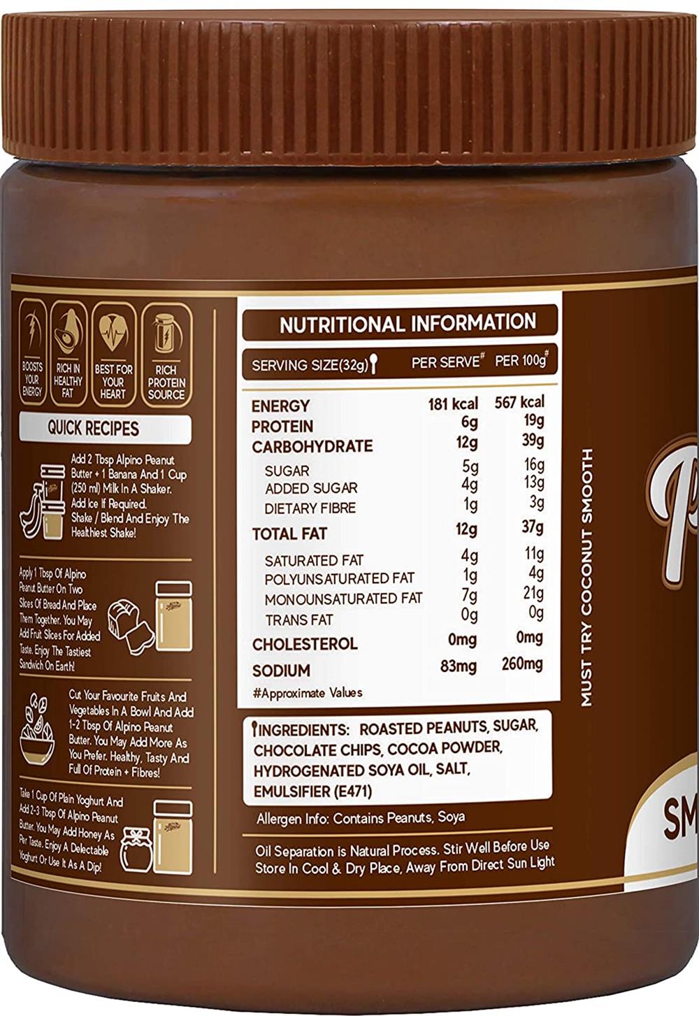 Made With High Quality Roasted Peanuts, Cocoa Powder & Choco Chips | 100% Non-GMO | Gluten-Free | Vegan 25% Protein Per Serving Of 32 G| Rich Source Of Fibre | No Trans Fat | No Cholesterol Good Source Of Vitamins E, B3 & B6 | Rich In Minerals: Iron, Magnesium, Phosphorous And Potassium Oil Separation Is Natural Process, Stir Well Before Use Together With The Confidence Of Knowing Your Peanut Contains No Stabilizers Or Fillers. Manufactured Under US FDA, APEDA, BRC, FSSC, HALAL, KOSHER, FSSAI, GMP, ISO 22000 Certified Facility, Under Strict Quality Control.