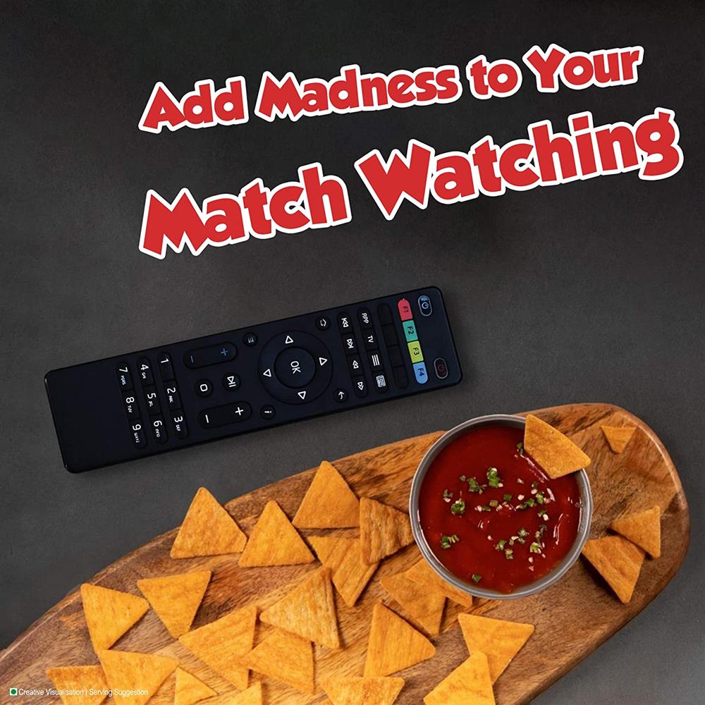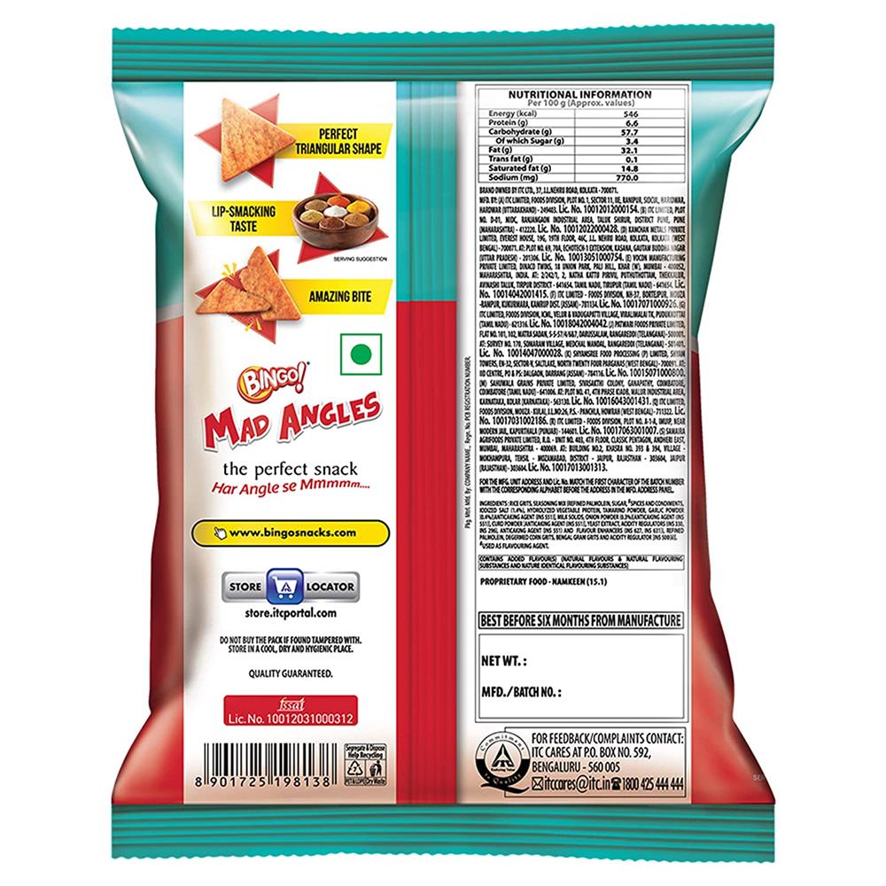 This is a Vegetarian product. Add some spice to your day as you pop open a bag of Bingo! Mad Angles Mmmmm Masala Treat your taste buds to a masaledaar flavour bomb with every crunchy bite Experience a satisfying crunch as the chips are made of corn-base which gives it a unique texture Satisfy your snack cravings with these super crunchy perfectly triangular Mad Angles chips which has a balanced flavour of masalas