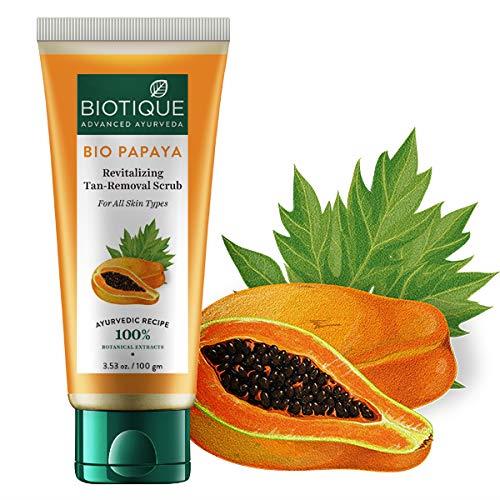 Quantity: 100g; Item Form: Scrub Dissolve dead surface cell Uncovers skin's natural brightness This Revitalizing Tan-Removal scrub is blended with pure papaya fruit. Dissolve dead surface cells.; Unclog pore openings and smooth the way for clear skin to surface Natural exfoliator For all skin types Gentle refining action uncovers skin's natural brightness for a younger-looking complexion; Application Area: Face How to use: massage on wet face and neck with fingertips, avoid eye area, remove with water or damp washcloth. Use daily or as needed Ingredients: papita fruit and seeds, kela fruit pulp, khajoor fruit pulp, neem bark, methi seeds, yasad bhasm, banhaldi Rhizome, a beej, bees wax, kikar gum, moongphali oil, purified water q.S Country of Origin: India
