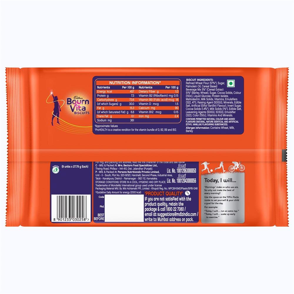 Cadbury Bournvita Biscuits are a great combination of taste and nutrition These Biscuits have the signature crunchy texture and chocolaty taste of Bournvita Perfect to be enjoyed in the mornings with a glass of milk, sets you up for a terrific day!