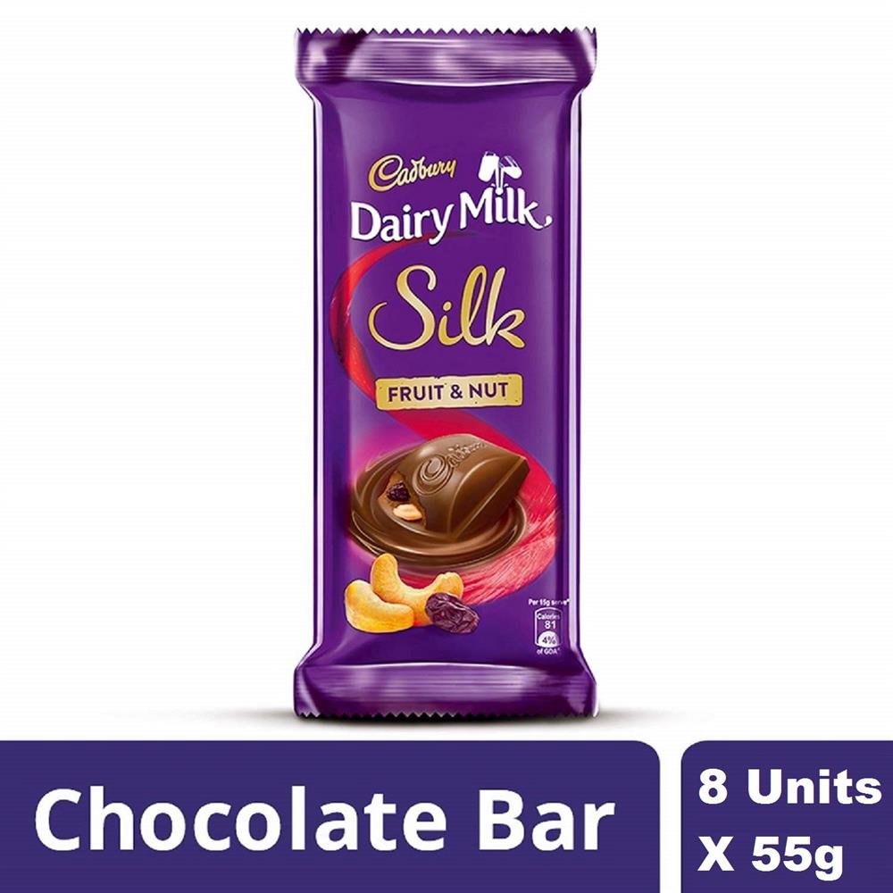 Discover Cadbury's deliciously creamy milk chocolate bar with raisins, cashews and apricot Plump raisins and chunky almonds are the source of all our fruity nuttiness It stands for goodness This pack contains Cadbury Dairy Milk Silk Fruit & Nut Chocolate Bar, 55g - Pack of 8 Country of Origin: India