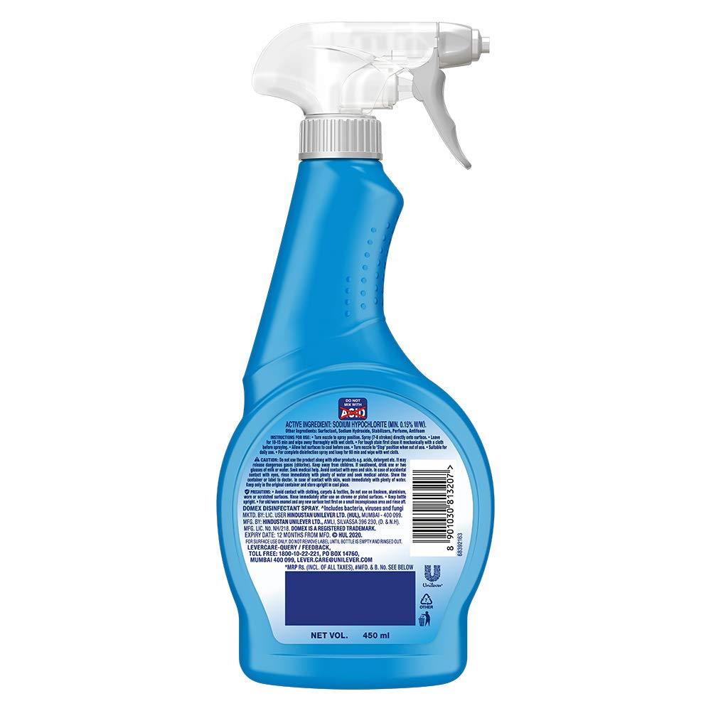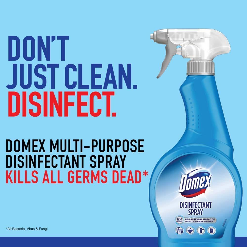 Domex Multi-Purpose Disinfectant Spray protects against infection causing germs Kills 99.9% infection causing germs, including bacteria, viruses and fungi Contains Sodium Hypochlorite as recommended by Leading Health Organisation for disinfecting surfaces Suitable for daily use to help keep your family protected Domex Multi-purpose Disinfectant Spray can be used on all surfaces