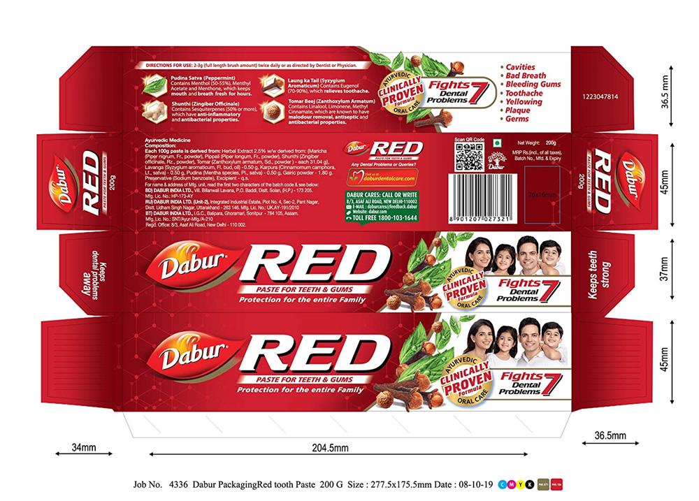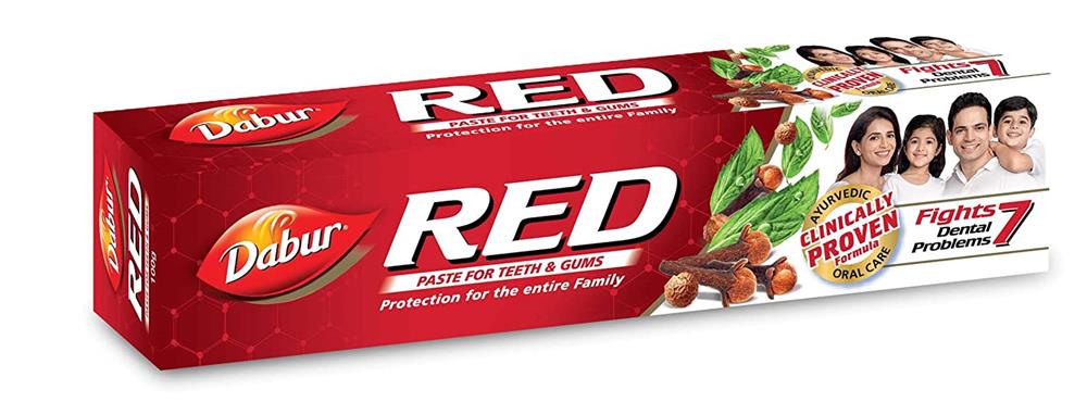 Dabur Red is India’s No. 1 Ayurvedic Fluoride Free Paste which is a complete Ayurvedic Oral Care for your family. It provides 35% betterment on oral care hygiene index in comparison to other regular toothpastes. Dabur Red Paste provides protection from 7 dental problems: cavities, gingivitis, plaque, toothache, bad breath, yellow teeth, plus weak teeth, and gums. Dabur Red Paste is made with 13 potent Ayurvedic ingredients such as Laung, Pudina & Tomar. Laung, or clove, helps relieve toothache. Pudina, or mint, acts as a mouth freshener, thus, removing bad breath. Tomar, or Aramacs, has anti-bacterial properties. Dabur Red Paste, formulated with traditional Indian recipes, protects from all sorts of dental problems, and helps with sensitive teeth.
