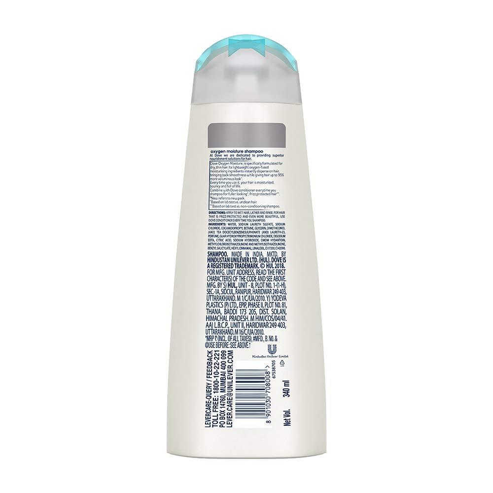 Dove oxygen moisture shampoo breathes life into fine hair Nourishing system for up to 95 percent more volume and fullness in fine, flat hair Dove shampoo gives limp hair bounce with natural volume With oxyfusion technology for fuller hair that isn’t weighed down Beautiful, healthy hair with every wash Volumizing shampoo suitable for daily use. Hair Type: Dry Hair. Detangles Hair with Ease. To facilitate easy detangling of your hair, this volumising shampoo glides effortlessly onto your hair. Easy to Use: Apply this shampoo onto your wet hair, focusing on its ends, and then rinse it off.