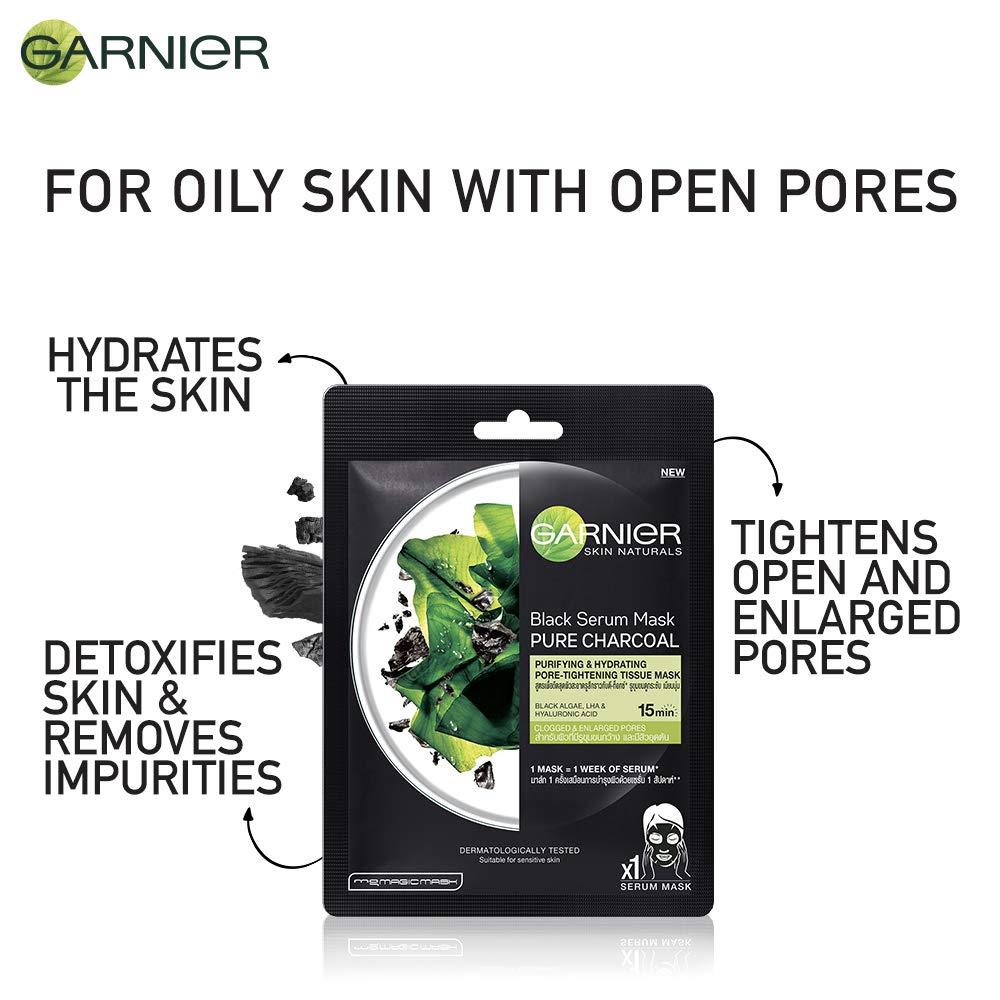 Garnier Black Serum Mask is a breakthrough black tissue mask technology that offers double purifying and hydrating efficacy