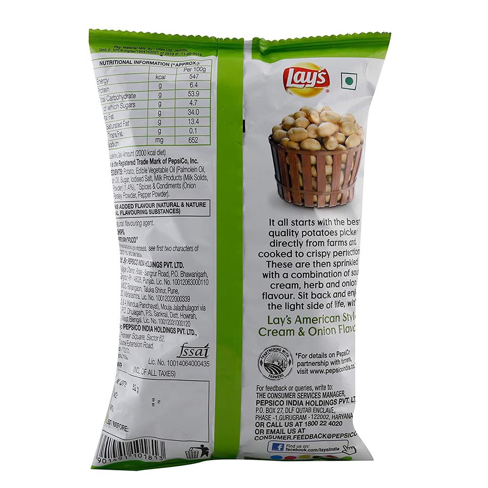Any party is incomplete without friends, fun and Lay's Order a pack now and kick-start your party Relax with your friends with the irresistible flavour of American style cream and onion Lay's 100 percent vegetarian, best quality potatoes, finest quality of spices and edible vegetable oils Trans-fat free