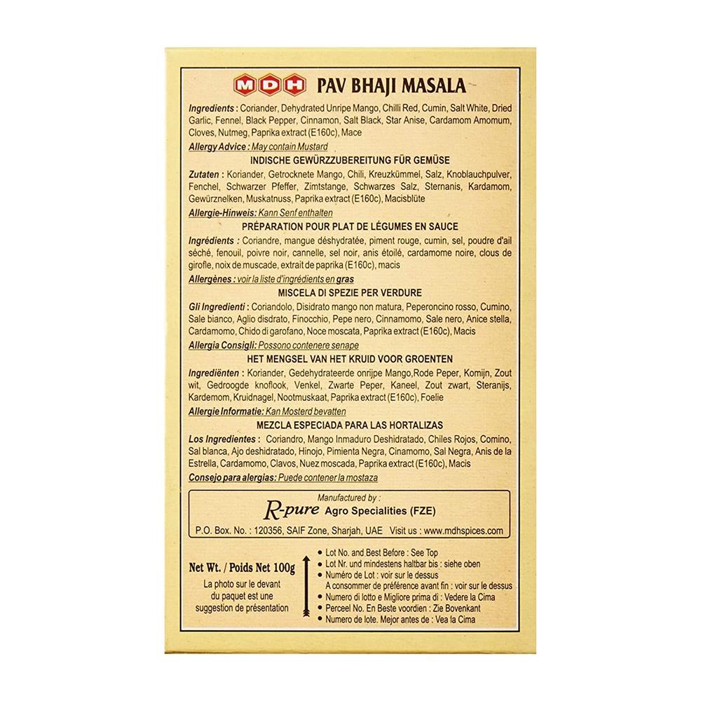 MDH pav bhaji masala is a special masala especially flavoured to create the rich and exotic taste of Indian pav bhaji