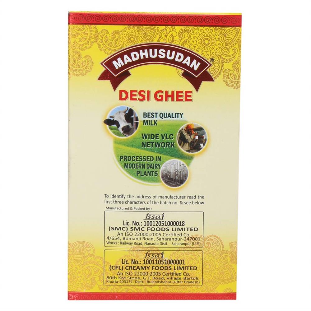 This is a Vegetarian product. Made from fresh and pure milk Has rich characteristic aroma and delicious taste Package Contents: Madhusudan Desi Ghee, 500ml Makes for a nutritious cooking medium Offers great health and taste in every spoon