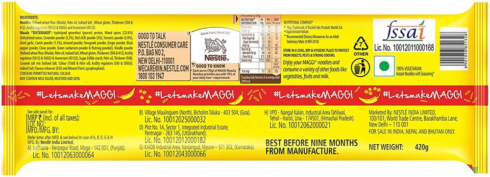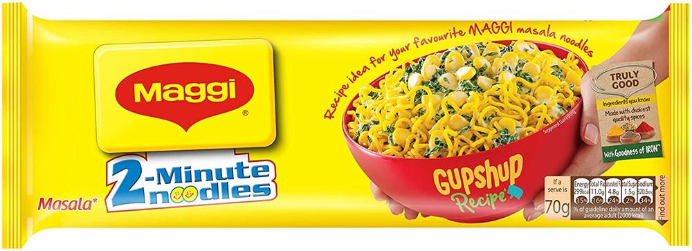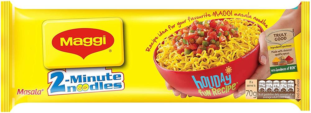 MAGGI 2-min Noodles with your favourite masala taste! MAGGI Masala Noodles is made with the choicest quality spices and ingredients for the taste your heart loves Each serve (70g) provides 15% of your daily Iron requirement* Country of Origin: India Truly Good!!! Ingredients you know. Made with Choicest Quality Spices.
