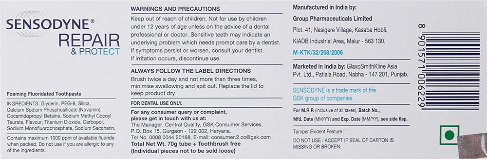Sensodyne is the #1 Dentist recommended toothpaste brand for sensitive teeth Clinically proven relief and daily protection for sensitive teeth Provides effective lasting relief from the sensation of sensitivity and offers everyday cavity protection Contains patented NovaMin technology, which seeks out and forms a tooth-like layer over vulnerable areas of the tooth Contains fluoride to prevent cavities so that you can use it every day With twice daily use, Sensodyne Repair & Protect continuously repairs, strengthens and protects your teeth