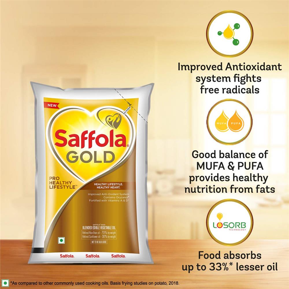 New Saffola Gold, Pro Healthy Lifestyle, edible oil, is a blend of 70% refined rice bran oil and 30% refined sunflower oil MUFA and PUFA: New Saffola Gold edible oil has a good balance of MUFA & PUFA as advised by NIN/ICMR. Dual Seed Technology: Gives you the goodness of two oils in one. LOSORB Technology: Results in upto 33%* lesser oil absorption in your fried food (*Basis frying studies on potato, 2019). New Saffola Gold blended cooking oil contains the power of natural anti-oxidants that helps reduce free radicals and thus helps keeps your heart healthy. Country of Origin: India