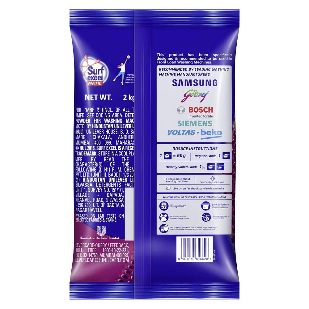packaging may vary - also available in polybag Surf excel matic front load laundry detergent is designed to work in high water level (20 liters) of front load washing machines Surf excel matic front load laundry detergent dissolves completely leaving no residue on your clothes on in the machine Surf excel matic front load laundry detergent produces the right amount of foam that protects your expensive front load machine from choking or clogging Surf excel matic is value for money . 1 scoop of Surf excel matic = 2 scoops of ordinary handwash detergent Surf excel matic front load laundry detergent is the no.1 matic detergent and is recommended by leading washing machine manufacturers