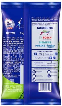 packaging may vary - also available in polybag Surf excel matic top load is designed to work in high water level (40 liters) of top load washing machines Surf excel matic top load laundry detergent dissolves completely leaving no residue on your clothes on in the machine Surf excel matic top load laundry detergent has an advanced technology that gives you handwash like clean in machines itself Surf excel matic is value for money . 1 scoop of Surf excel matic = 2 scoops of ordinary handwash detergent Surf excel matic top load laundry detergent is the no.1 matic detergent and is recommended by leading washing machine manufacturers