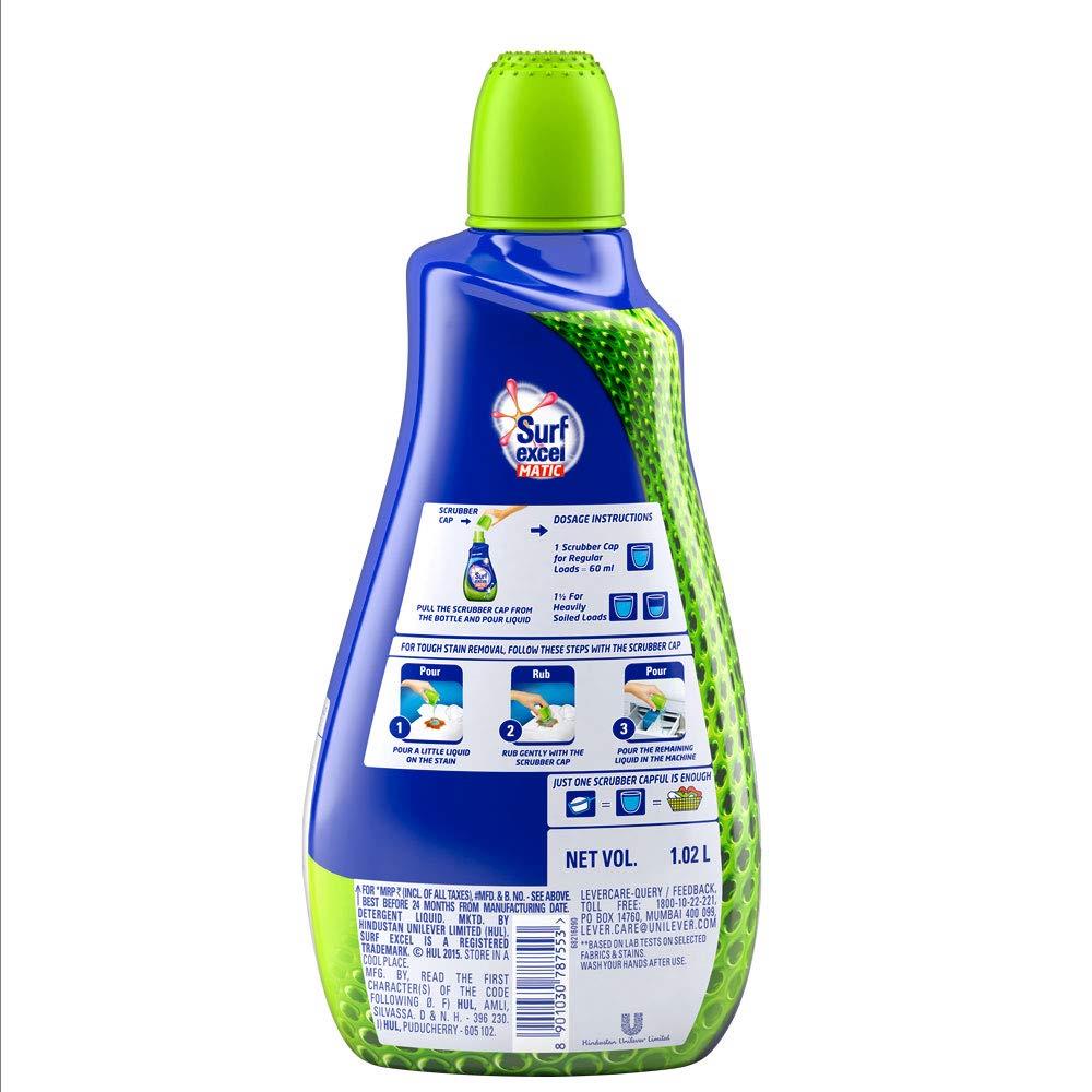 New Surf excel matic liquid top load washing detergent gives you 100% stain removal in washing machines Faster Stain Removal in Machines - New Surf excel matic liquid detergent with a powerful cleaning technology penetrates stains faster and removes tough stains in machines itself Easy & Better Dissolution: Being liquid detergent it dissolves quickly in high water level environment of washing machines, reaches stains effortlessly and leaves no residue on clothes or in machines Machine Care: Its designed to produce foam as per washing machine type that ensures no clogging and choking of pipes and reduces scaling issues Superior Fragrance:It ensures that your clothes not only look fresh but also smell fresh Color Care: It removes tough stains in machines but retains original color of the fabric