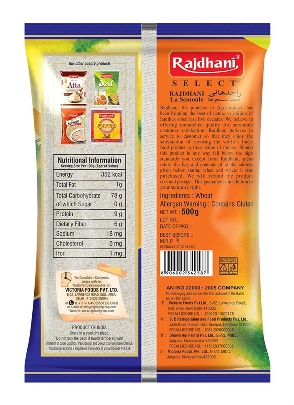 The most unique feature of our Sooji is that it is dried/light roasted to reduce moisture making it lighter and giving it a longer shelf life. This drying process also results in better yield while making the final product as the water and oil absorption is optimal,Contains Gluten
